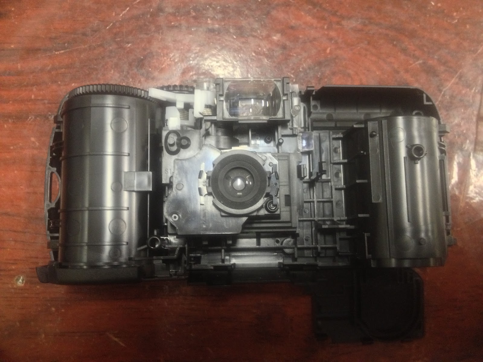 カメラの殻を割って回路が見えて来ましたがここで注意です。使い捨てカメラはフラシュを焚く際にコンデンサに充電をします。なので,その放電が完全に出来ていないと回路を触った時にビリッと感電します。かなり痛いです。(自分は小学生の頃,使い捨てカメラの電池欲しさに解体したら,基板に触って感電したことがありました(^^;)1分ぐらい手が麻痺しました(汗))