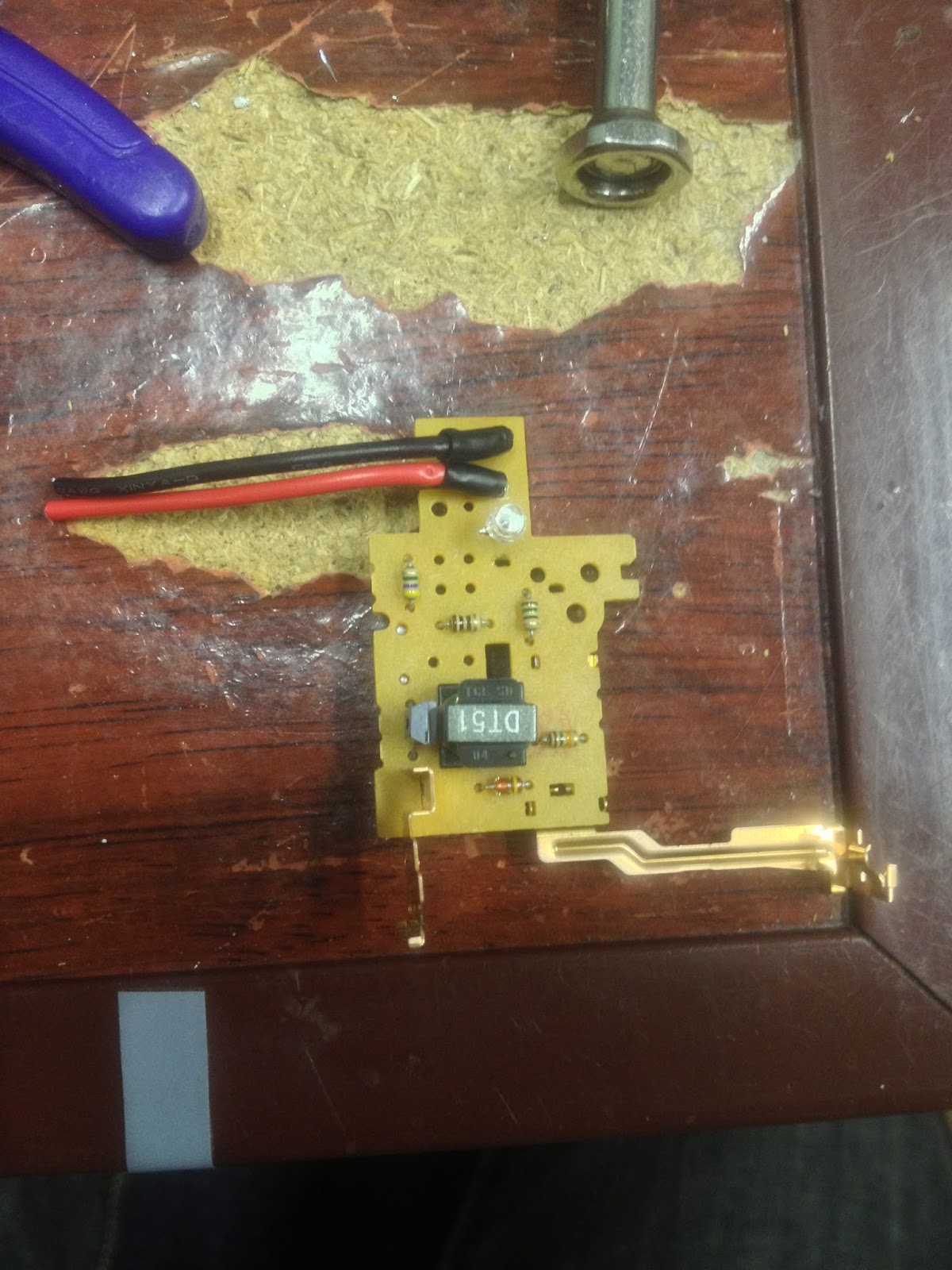 ここからトランス,抵抗,透明なダイオード以外は全部取り外します。また,もともとコンデンサがついていた所から電源出力用の線を2本生やします。